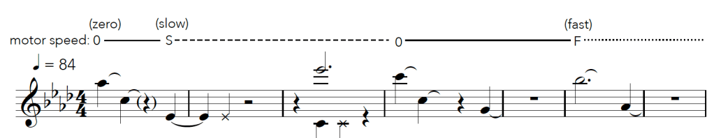 It could also be ideal to create some sort of abbreviations to avoid getting too wordy in your score. For example, composer Kristofer Svensonn wrote a beautiful piece for me, entitled Förmiddagens klara, sorgset bleka ljus stilla sväva, that specifies three motor speeds: none, slow, and fast. This leaves some decision making to the performer, and doesn’t provide so many specifications to the point of confusions. In addition to using symbols (0, S, and F) for the starting points of the motor speeds, he uses three different lines (solid, dashed, and dotted), as a handy reminder of what should be happening in a given moment. This is all visible in the opening of the piece, shown here: